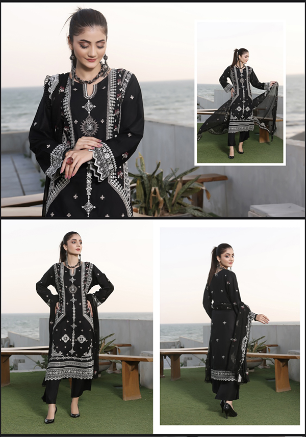 This material is Pakistani brand khoobsurat .three pieces cotton shirt , cotton pant and chiffon dupatta, shirt and dupatta fully embroidery.